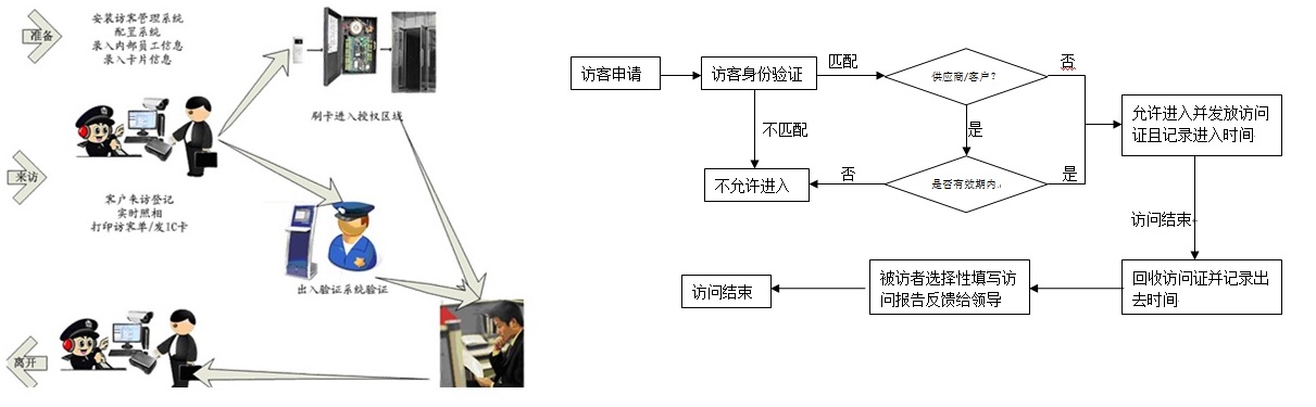 - 访客管理由企业内部员工提前发起申请,经过逐层审批确认到达门卫保安(前台)处,访客到来时,只需通过身份证(其他证件)识别匹配后即可放行,减少需要再次确认的工作。